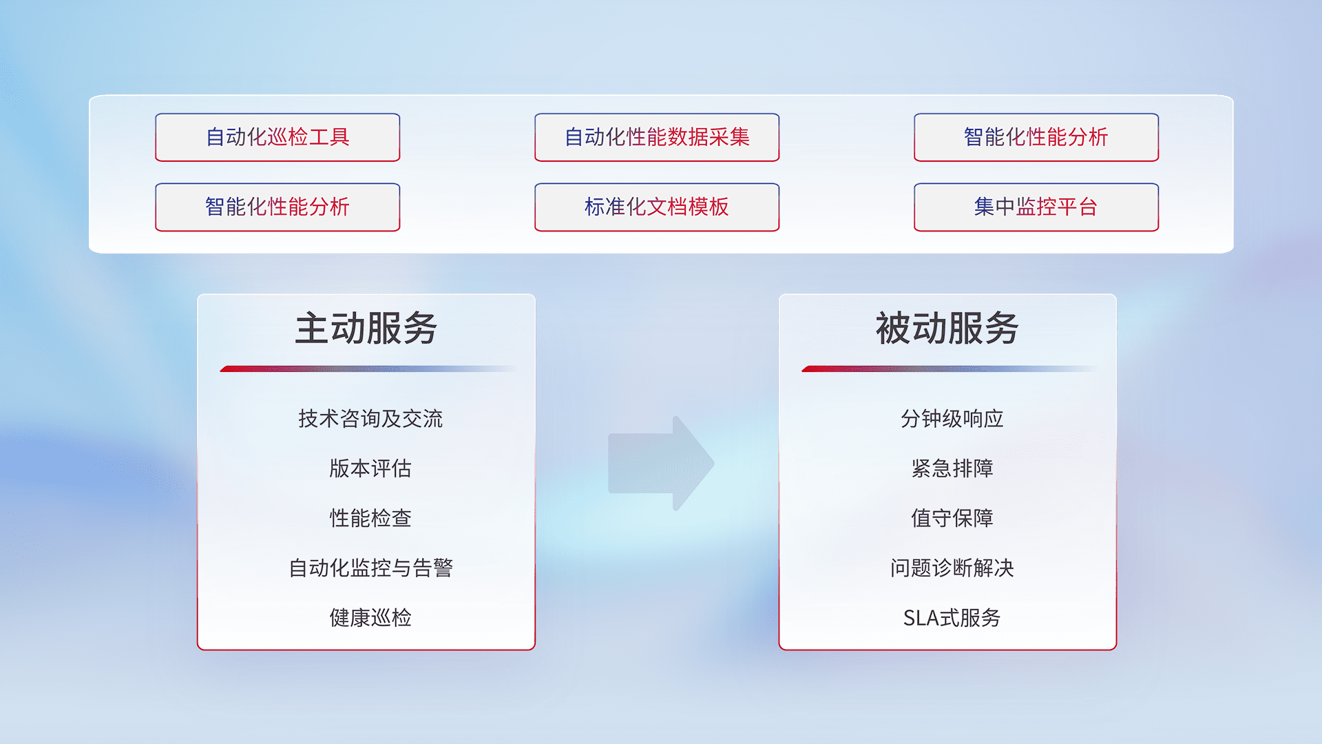 智能化工具和标准化文档,,保障服务质量,,提供主动服务(包含技术咨询、、版本评估、、性能检查、、、、自动化监控与告警、、、健康巡检)和被动服务包含(分钟级响应、、、紧急排障、、、值守保障、、、、问题诊断解决、、SLA服务)。。