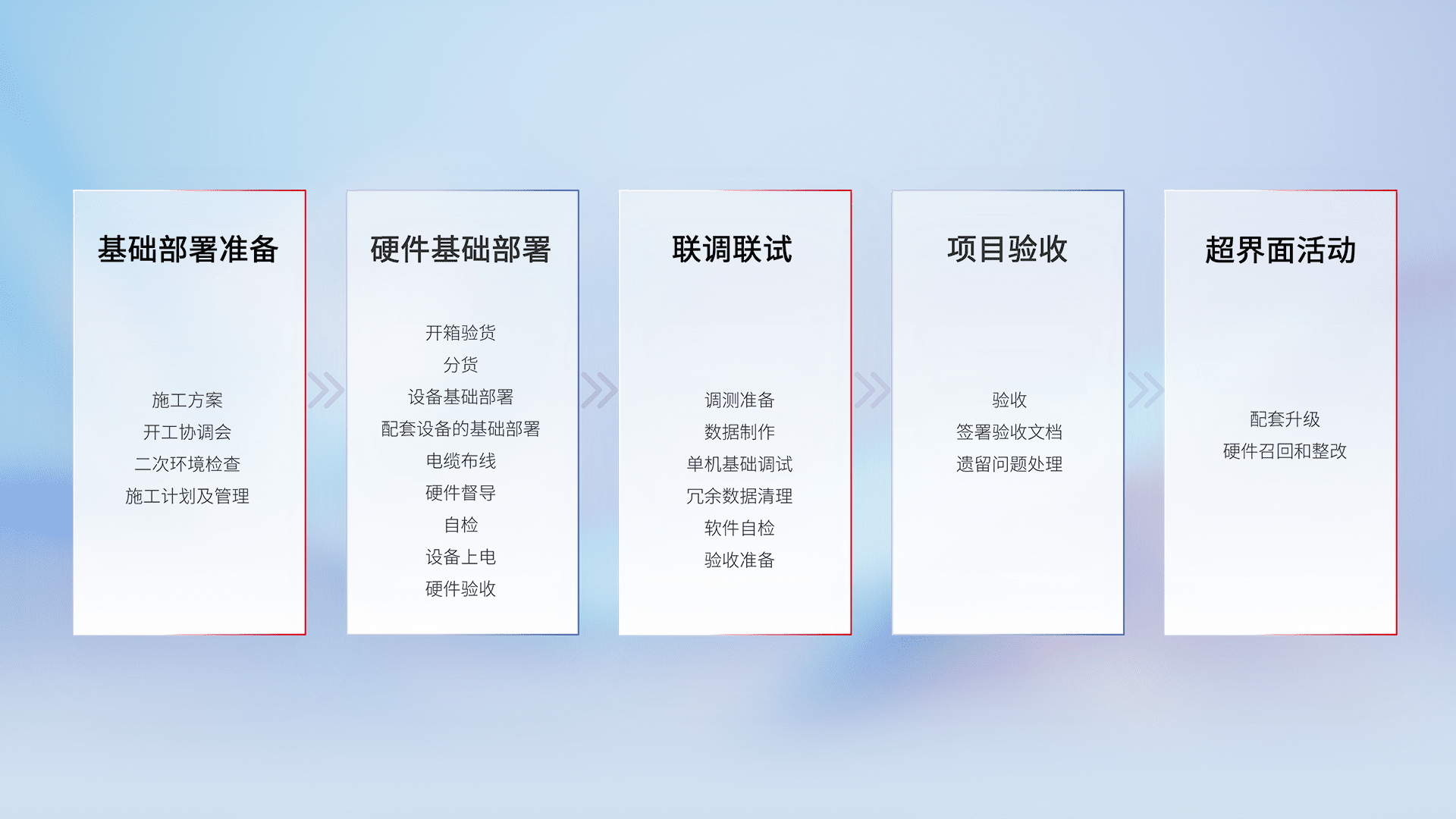 从基础部署准备、、硬件基础部署、、联调联试、、项目验收、、越界面活动的全过程可追溯,,保证施工质量和进度。。